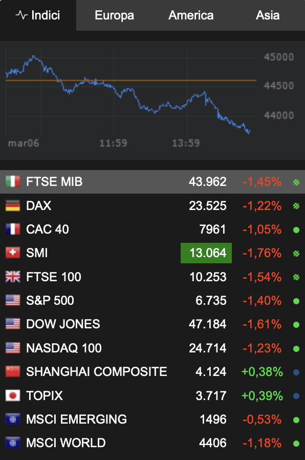 Anche Piazza Affari resta debole, con il FTSE MIB che oscilla intorno ai 45.800 punti, dopo aver aperto la giornata poco sopra i 45.700 punti.